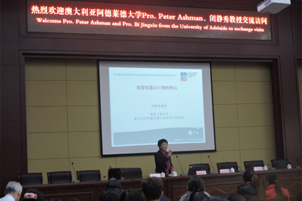 2015年12月8日,澳大利亚阿德莱德大学化学工程学院院长Pro.Peter Ashman与闭静秀教授应邀对pg国际进行交流访问。上午双方就制药工程专业合作办学、研究生联合培养、教师交流互访、科研项目合作等方面进行了洽谈。下午,两位教授以阿德莱德大学化工系和制药工程专业特色介绍及疫苗和蛋白药物的制备为题做了学术报告。