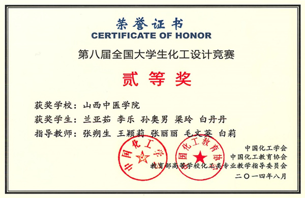 今年暑假,经过前期的充分准备,制药与食品工程学院组成的由张朔生教授负责,王颖莉、张丽丽、毛文英、白莉为指导教师,制药工程专业11级兰亚茹等5名同学为队员的“探路者”设计团队,首次参加了第八届全国大学生化工设计竞赛,该团队向竞赛委员会提交了名为“年产1500吨溴甲烷甲苯甲基化PX项目”的设计作品,经过师生们的共同努力和激烈拼搏,最终喜获全国总决赛二等奖、西北赛区三等奖。
