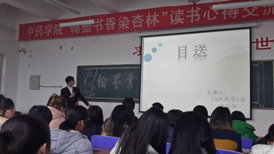 为了培养同学们的读书兴趣,形成良好的文化风气,中药学院给同学们提供了一个分享阅读快乐的平台,12月21日晚6时20分在仁济书院甲座223教室举办了“翰墨书香染杏林”读书心得交流会决赛。此次大赛有幸邀请到了学生处副处长田文婧、中药学院党总支书记郭继林、中药学院党总支副书记庞维荣、中西医临床学院党总支副书记赵瑞宝、学工办主任李刚及辅导员董虹玲参加。由李柯辉、徐士洋、叶琪和马宁主持。