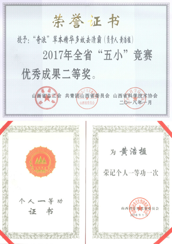 在由省总工会、团省委、省科协联合举办的首届山西省“五小”竞赛活动中,pg国际中药学院2015级临床中药班黄浩楹同学的“奇浪”草本精华多效去渍霸作品喜获优秀成果二等奖,省劳动竞赛委员会为其荣记个人一等功一次并奖励8000元。