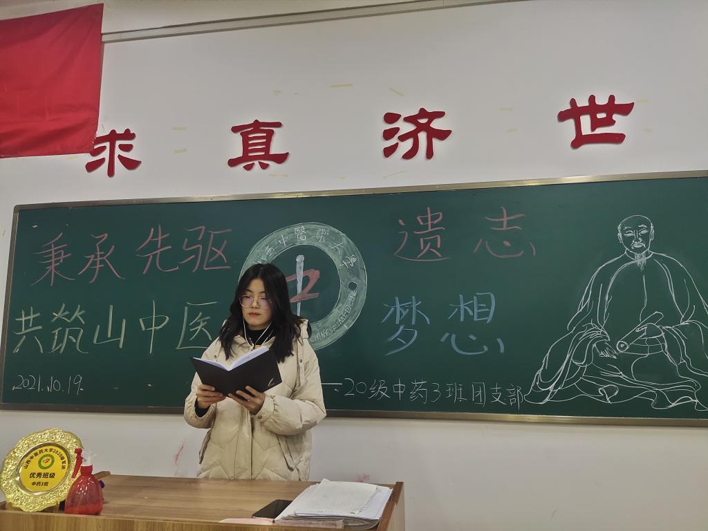 2020级中药3班全体同学,于10月19日晚上七点三十分在和剂书院甲座213教室举办“秉承先驱遗志,共筑山中医梦想”主题团日活动。此次活动由团支部书记杨紫悦主持,20级中药3班全体同学参加。