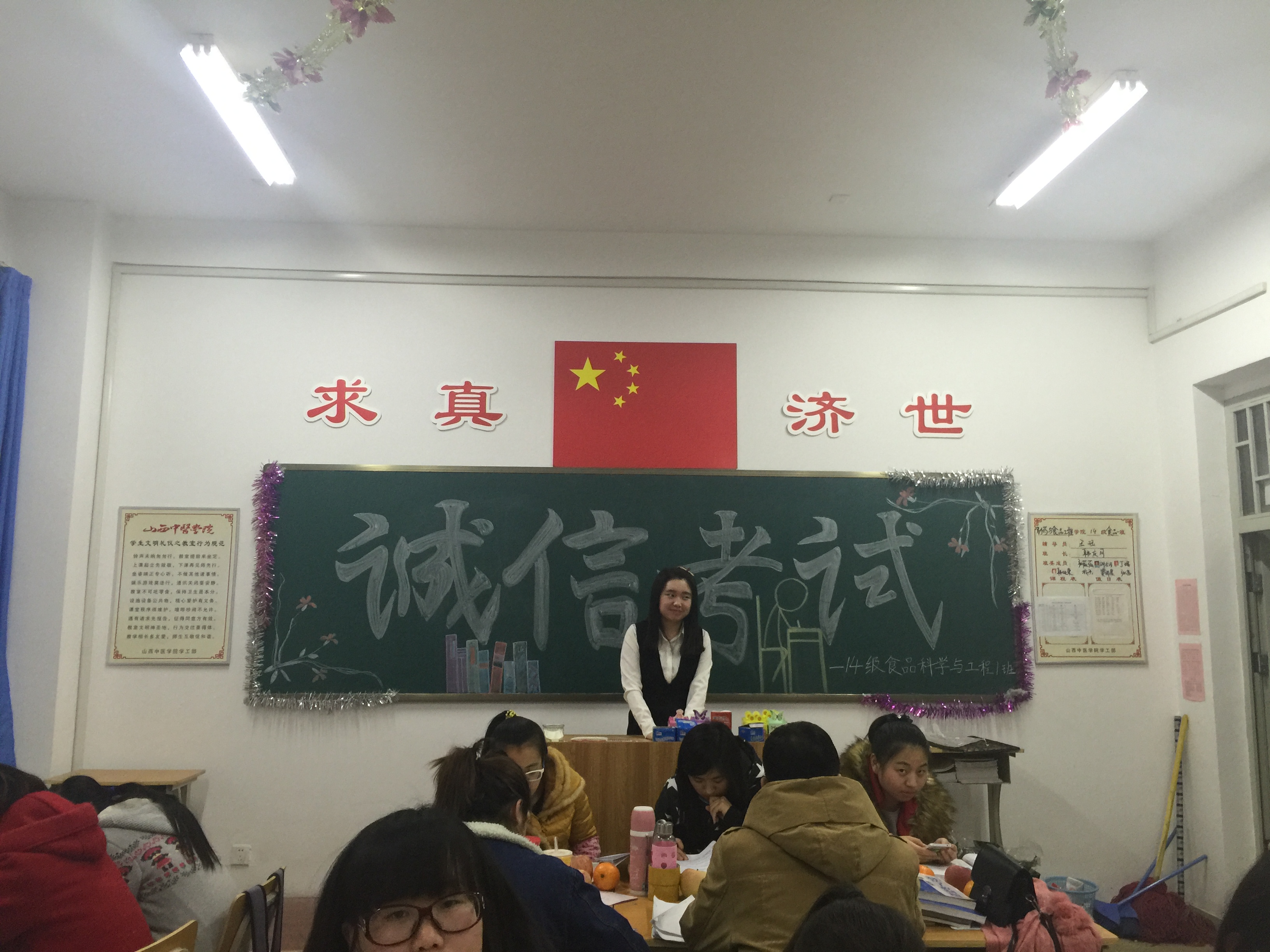 习近平总书记中国科技大学观察和在知识分子,劳动模范,青年代表座谈会上的讲话中,专门对大学生提出“做有理想、有追求的大学生,做有担当、有作为的大学生,做有品质、有修养的大学生”的明确要求,希望广大青年学生要深入学习总书记的重要讲话精神,准确把握科学内涵和精神实质,并用来武装头脑,指导实践,促进成长。不信不立,不诚不行。因此在考试月即将到来之际,2016年12月20日下午4点,制药与食品工程学院14级食品科学与工程1班在和剂书院207教室举办以“诚信考试,做六有青年”为主题的以努力提高综合素质,营造优良学风和公平公正的竞争环境,弘扬诚实守信道德风尚,强化学生遵守考试纪律的意识,学习贯彻落实习近平总书记的“六有青年”为目的的班级活动。、