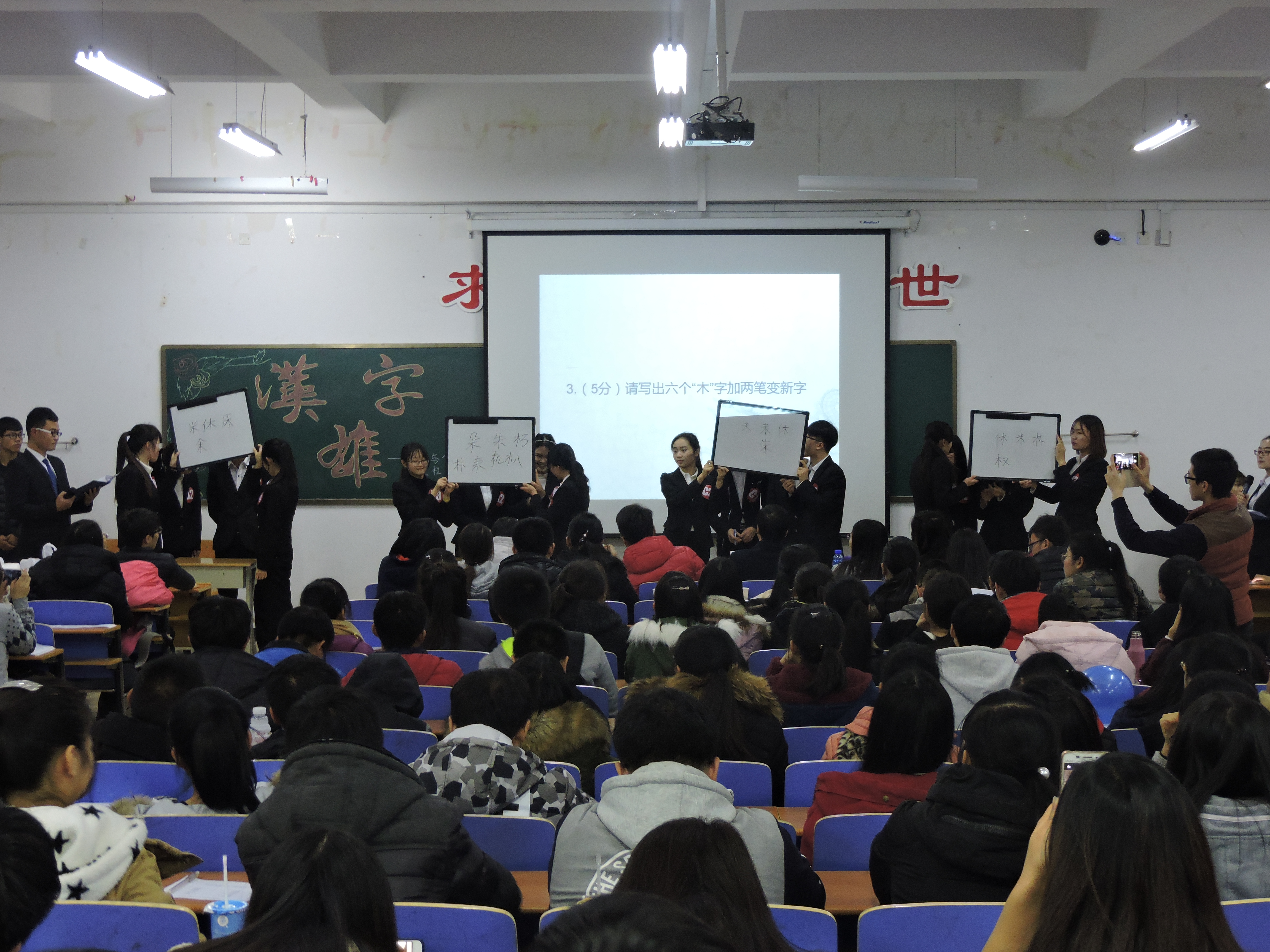 凭借扎实的汉字功底以及对汉字的热爱,经过初赛的层层选拔,最终共有4支队伍16人进入到了决赛的现场,每位选手都气定神闲运筹帷幄,赛前剑拔弩张的紧张气氛已经深深的感染了每一个到场的观众。汉字英雄决赛包括集思广益、群雄逐鹿、决战巅峰三个环节。比赛中,时间飞速流逝,参赛的同学争分夺秒,脑筋飞快的转动,手上的动作也不拉下,尽自己最大的努力把脑海中存储的汉字全部写上。在答对时他们欣慰一笑,答错时他们互相勉励,不气馁。 为缓解比赛的紧张氛围,在赛程中安排了动人的歌曲《朋友》及使人捧腹大笑的《手机综合征》小品,赢得席上掌声阵阵。在经过两小时的角逐后,扬帆队荣获冠军。