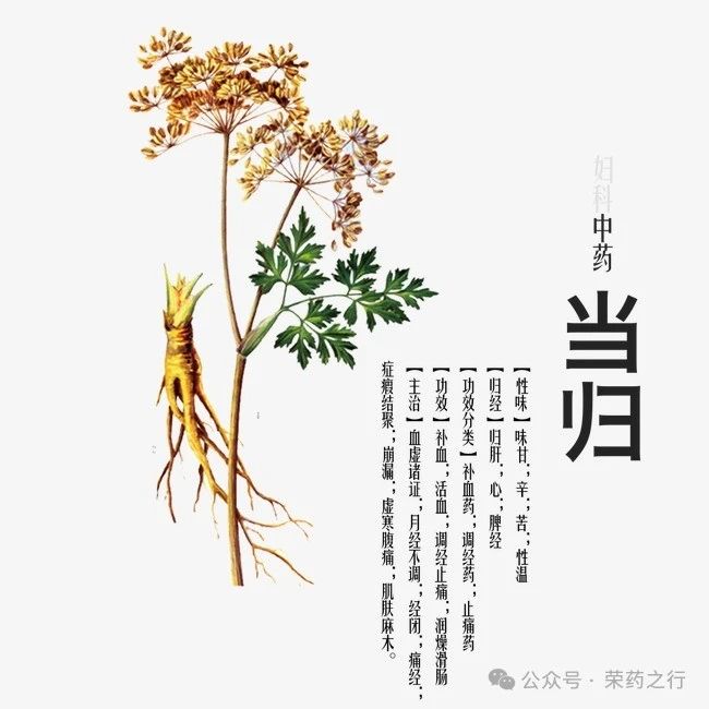由此也可佐证当归的药用历史可以追溯到东汉时期,而后,各位医家对当归的使用也在不断拓展延续。当归药性为甘,辛,温。归肝,心,脾经。有着“补血之圣药”之称。可见当归是一种常用的补血药,具有多种药效,如补血、活血、调经、止痛等。在中医治疗中,当归常常与其他药物配伍使用,以达到更好的治疗效果。当归常用于治疗贫血、月经不调、痛经、产后瘀血等妇科疾病,以及各种虚证,如气虚、血虚等等。若遇到血虚萎黄,心悸失眠以及妇女月经不调,经闭,痛经等血虚证,在《和剂局方》中有一方剂,使用当归配伍熟地黄,白芍,川芎来治疗,即四物汤。若月经不调、证属冲任虚寒、瘀血阻滞者,可配伍白芍、桂枝、吴茱萸等,即温经汤;证属肝郁气滞,可配伍柴胡、白芍、白术等,即逍遥散。当归也是活血行瘀的良药。可以治疗虚汗腹痛,风湿痹痛,跌仆损伤,痈疽疮疡。如当归建中汤,配伍桂枝助阳化气,生姜温中健胃,白芍养血调经,以及十全大补汤可以配伍黄芪补气升阳,人参滋阴益气,肉桂散寒助阳等等。