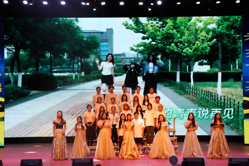 “只要用心就能看见,从白云看到不变蓝天”,清澈且充满力量的和声响起,如同电影里主角们对生活、对梦想的无畏追求,这也仿佛是毕业生们对未来许下的庄重誓言。演唱过程中,舞台背景的大屏幕上播放着表演者精心录制的视频,这些画面与歌声相互交织,就像电影情节与主题曲的完美融合,将现场的气氛推向又一个高潮。