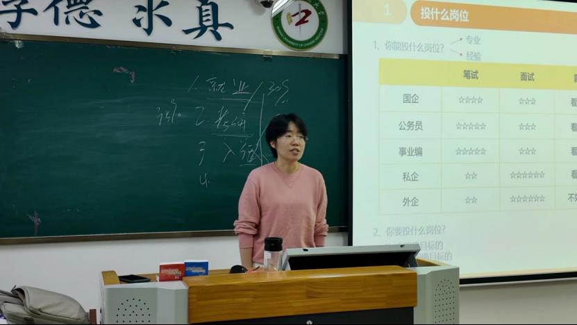 讲座中,武婧首先围绕“投什么岗位”展开,通过对比国企、公务员、事业编、私企、外企在笔试难度、面试强度、薪资水平及发展前景等维度的差异,引导学子结合自身专业与经验,明确求职方向。
