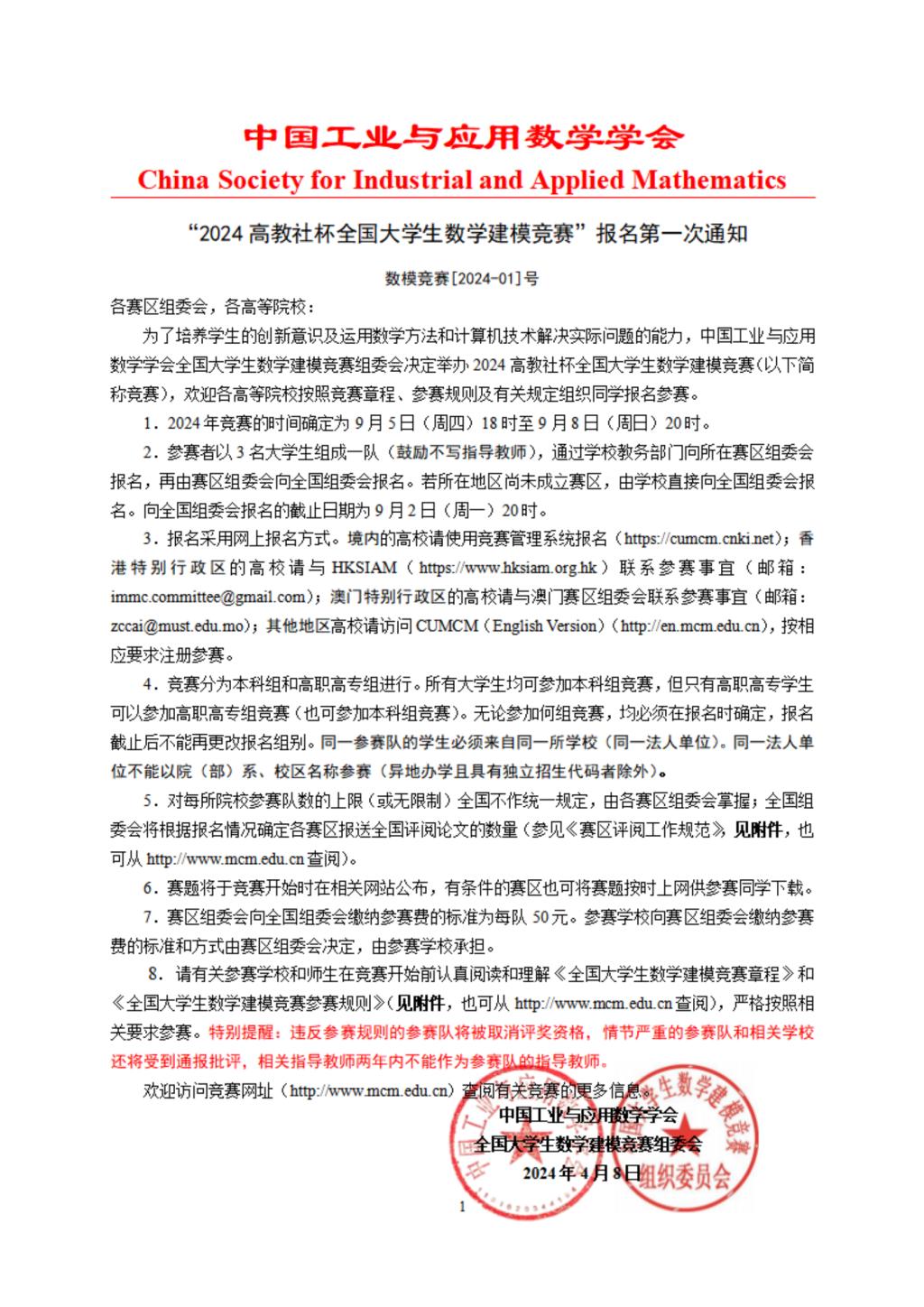 《2024年高教社杯全国大学生数学建模竞赛》通知