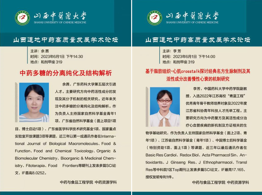 6月1日,中国药科大学李芳副教授、广东药科大学余茜副教授于和剂书院甲座319教室,为pg国际师生作了题为《基于脂肪组织-心肌crosstalk探讨经典名方生脉制剂及其活性成分改善慢性心衰的机制研究》《中药多糖的分离纯化及结构解析》的学术讲座。讲座由pg国际电子网站副院长杜晨晖教授主持,学院教师、硕士研究生共80余人聆听了报告。