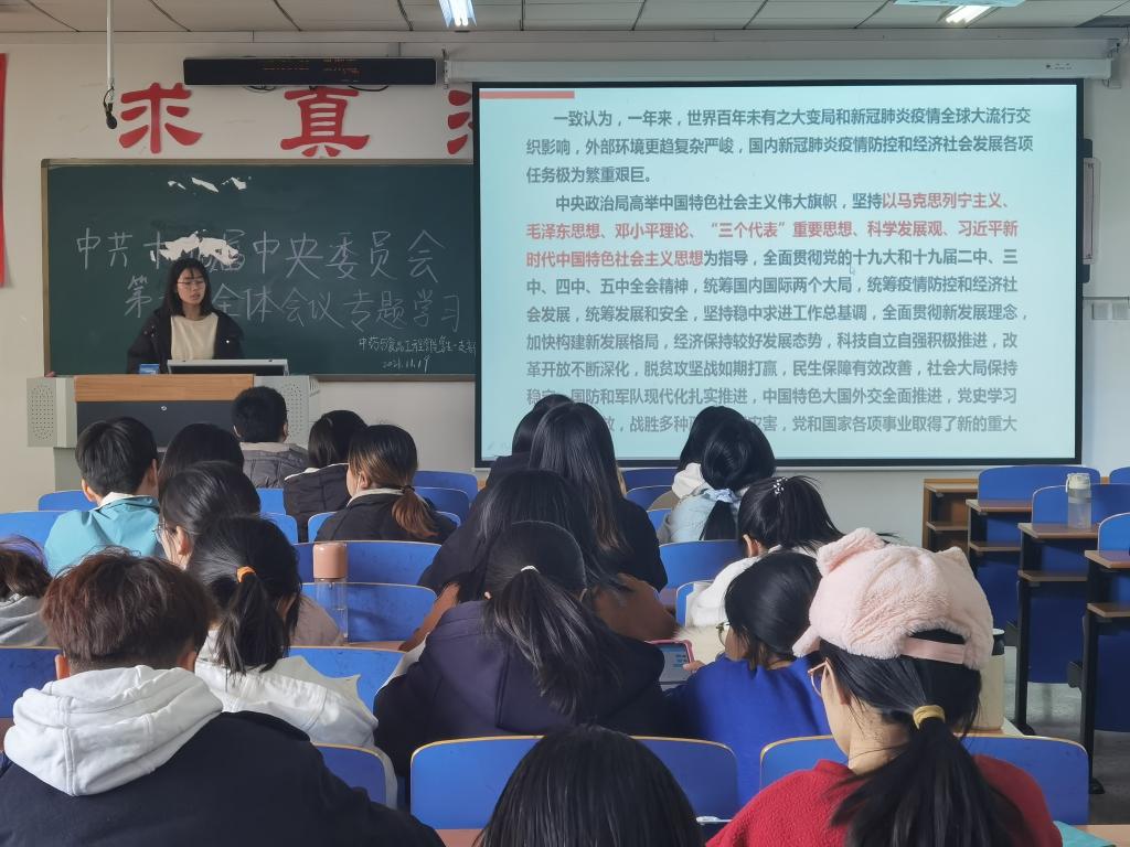会议开始,杨梅同志介绍全会主要内容:党的十九届五中全会以来中央政治局的工作成果显著;中共中央总书记习近平发表重要讲话,正式宣布全面建成小康社会;我们党在不同时期有不同的历史任务与使命,在中国共产党的百年奋斗过程中党领导人民成功走出中国式现代化道路,中国共产党无愧为伟大光荣正确的党;全党全军全国各族人民要更加紧密地团结在以习近平同志为核心的党中央周围,全面贯彻习近平新时代中国特色社会主义思想。同时,杨梅同志指出,作为学生党员,每个人都要脚踏实地、以史为鉴、开创未来,埋头苦干、勇毅前行,为实现第二个百年奋斗目标、实现中华民族伟大复兴的中国梦而不懈奋斗。