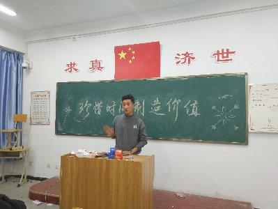 时间对于军事学家来讲,珍惜时间就是胜利。红军要飞渡金沙江,夜以继日地行军,其目的就是争取时间,夺取胜利。可见珍惜时间是多么重要,这关系着祖国的生死存亡。时间对于经济学者就是金钱,就是效率。为使同学们领悟时间的重要性合理利用时间,15级食品科学与工程三班在2017年12月11日晚在仁爱书院411教室举办“珍惜时间,创造价值”主题心理活动。