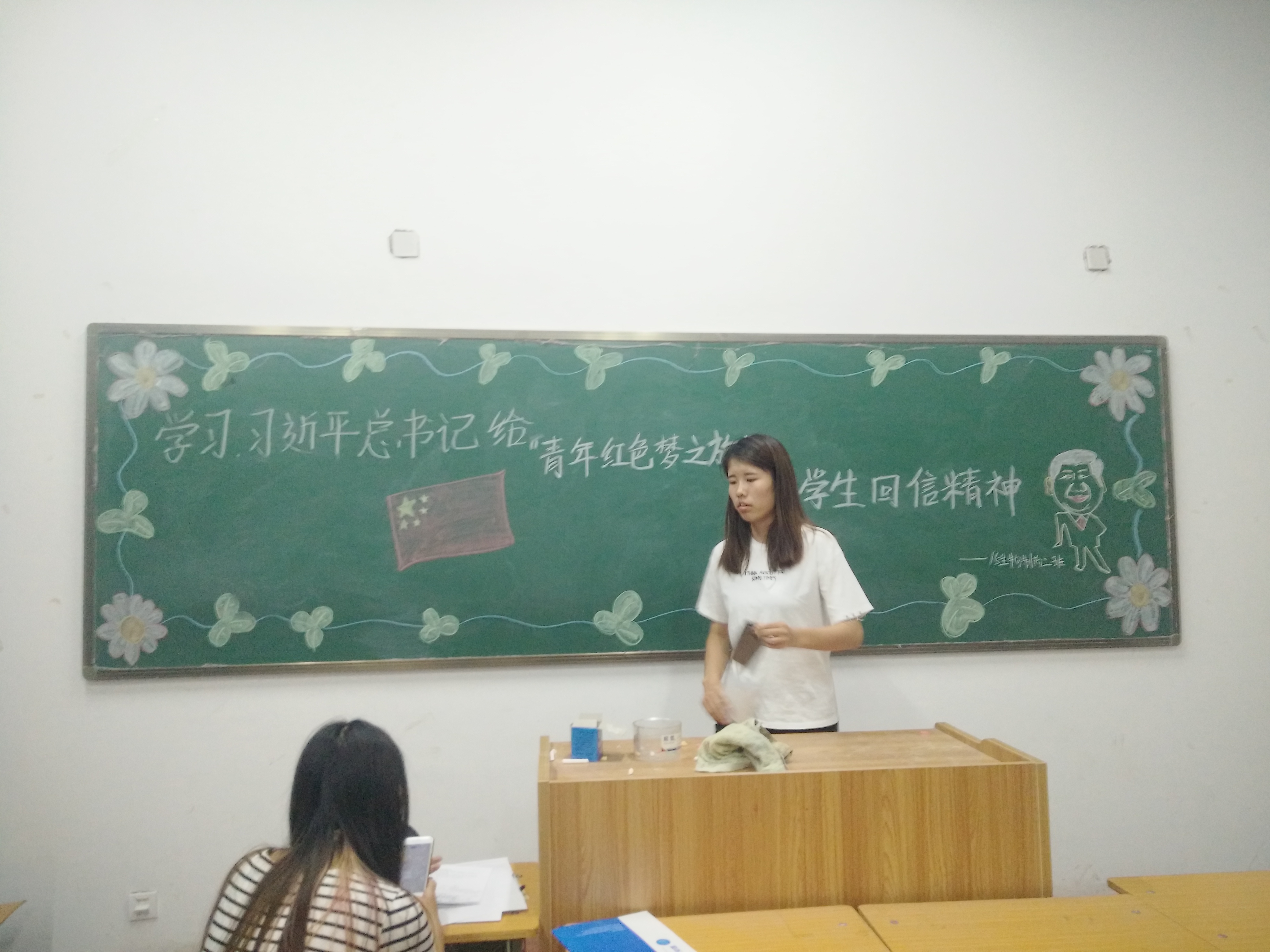 为深入贯彻落实团省委《关于组织全省大学生深入学习宣传习近平总书记给第三届中国互联网+大学生创新创业大赛“青年红色筑梦之旅”大学生回信精神的通知》精神,切实引导和帮助青年学生以习近平总书记系列重要讲话精神为根本遵循,组织引导团员青年深入学习回信的精神实质和丰富内涵,准确把握当代青年肩负的历史使命和成长发展的正确道路,自觉把激昂的青春梦融入伟大的中国梦。本班于2017年9月13日在仁爱书院108室开展以学习宣传习近平总书记给第三届中国互联网+大学生创新创业大赛‘青年红色筑梦之旅’大学生回信精神”为主题的团日活动。本次团日活动由本班团支书宋秋红主持开展,本班全体同学参加。