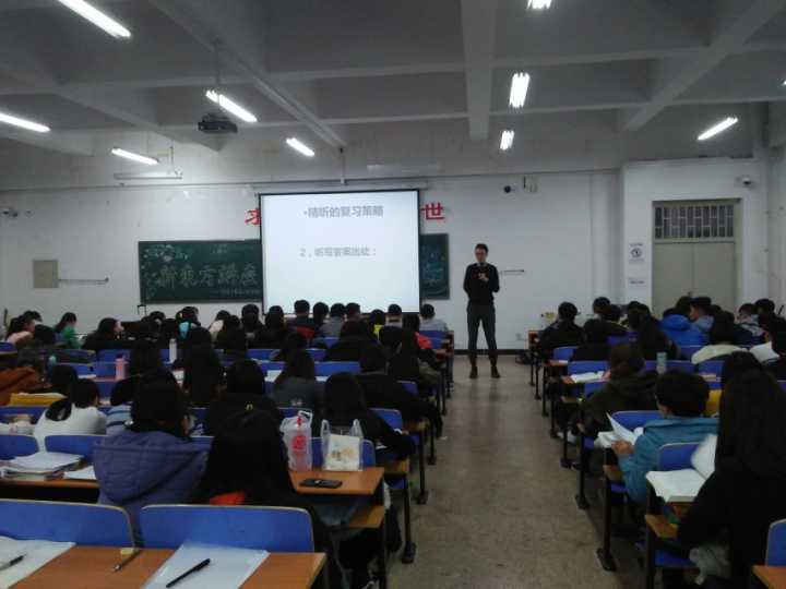 本次讲座由Austin老师主讲。他只要强调背英语单词时应该读着背,而不应该写着背,发音准确才能提高听力,作文、听力、阅读、翻译在四六级英语考试中所占的比例以及准确的复习策略等内容。在课堂上,同学们努力配合老师,认真听讲,并积极回答老师问题,完成一堂生动、高效、有趣的英语讲座。