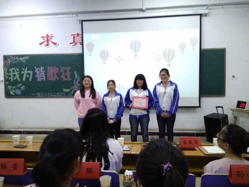 本次大赛分为听歌识曲、心有灵犀、疯狂MV三个环节。大赛一开始,伴随着优美的音乐,参赛成员全神贯注,在观众的欢呼声中不断猜中歌曲。在第二环节中,考验的是选手的默契,通过“你画我猜”的形式猜歌名,这不断地活跃了现场气氛。接下来是和观众的互动环节,由工作人员放歌,观众积极地猜歌。抢答环节就是考验选手们快、狠、准的手段了,选手们为了抢得题目的回答权都拼尽了全力,选手们表现镇定,自信果断,为了自己的队伍奋力拼搏。最终16食品“小姐姐”队荣获一等奖,16食品 “欣悦”队荣获二等奖, 15制药二班 “不完美女孩”荣获三等奖。